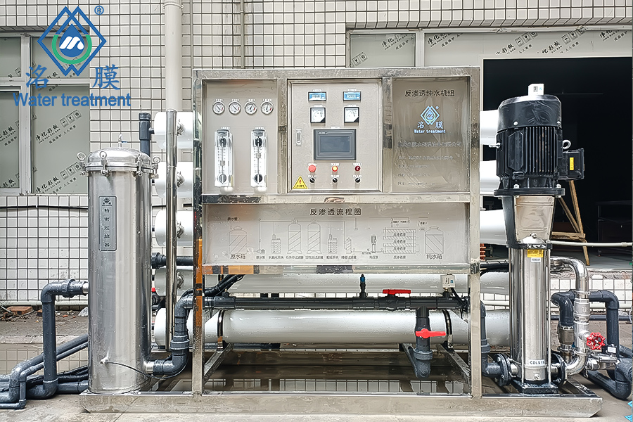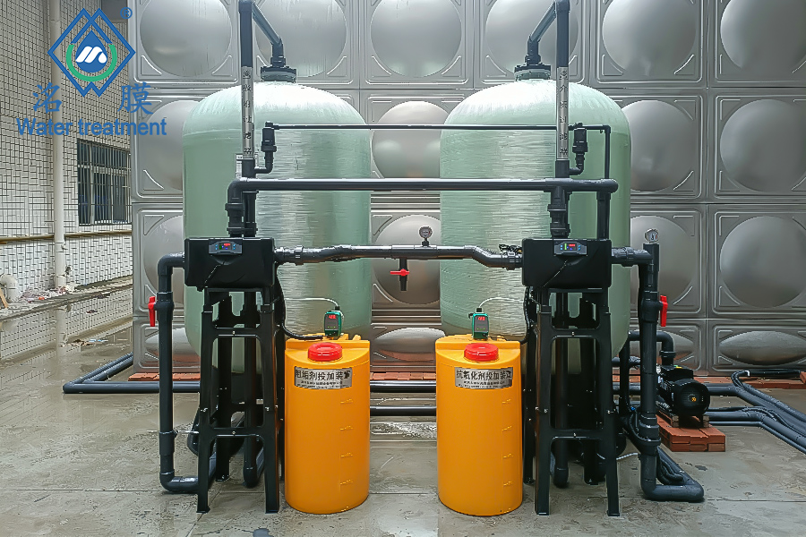 原水箱→抗氧化劑投加→介質(zhì)過濾器→吸附過濾器→阻垢劑投加→精密過濾器→RO膜→出水