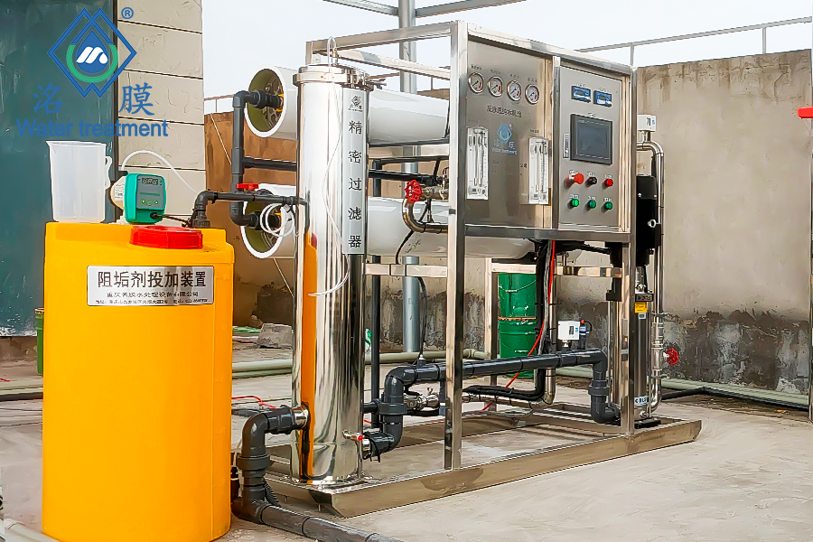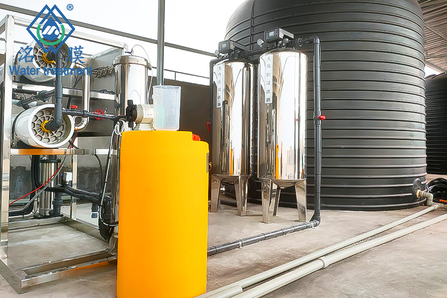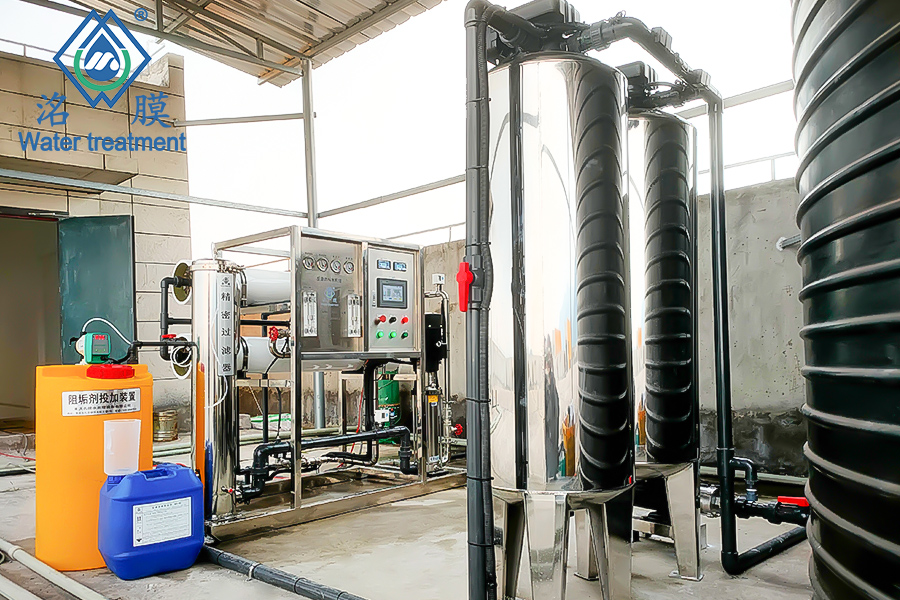 設備工藝+配置:多介質過濾→活性炭吸附過濾→阻垢劑投加→精濾過濾→RO膜