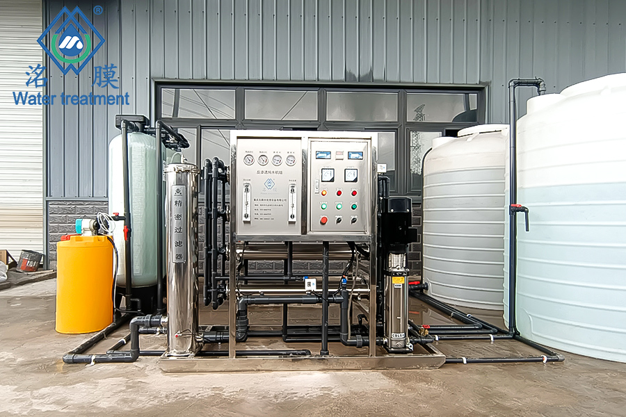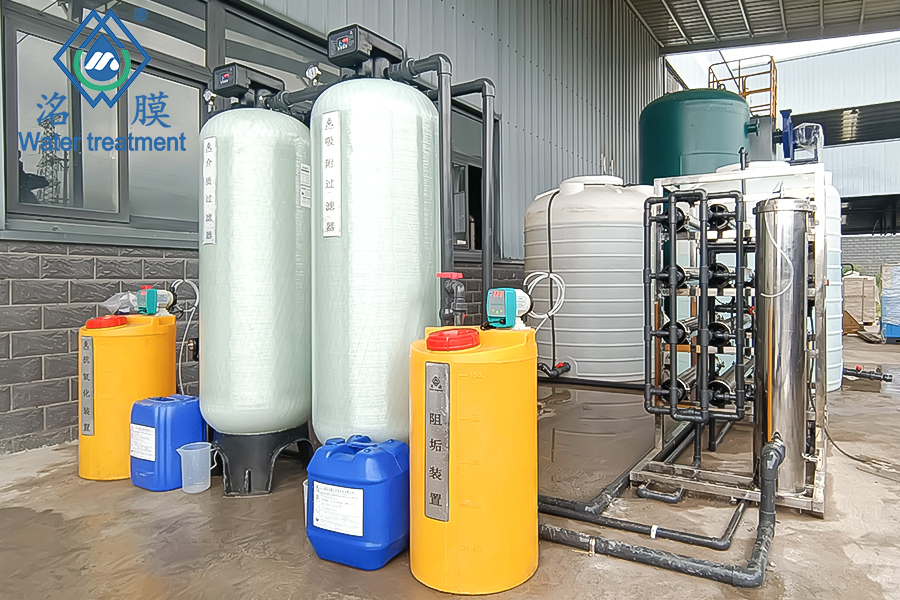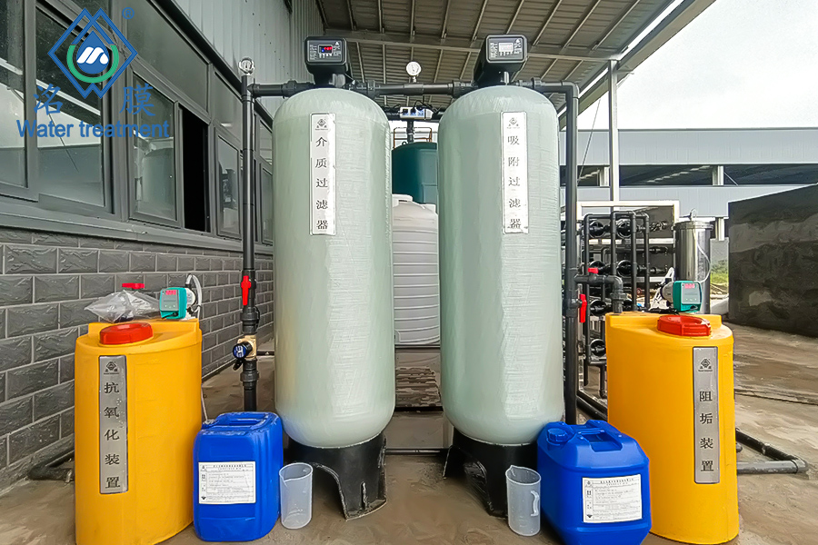 處理工藝:抗氧化劑投加→介質(zhì)過濾→吸附過濾→阻垢劑投加→精密過濾器→RO反滲透膜→純水