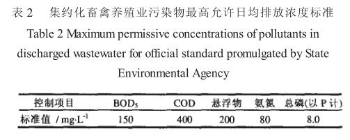 為控制畜禽養(yǎng)殖業(yè)產(chǎn)生的廢水、廢渣和惡臭對環(huán)境的污染, 國家環(huán)境保護總局發(fā)布了《 畜禽養(yǎng)殖業(yè)污染物排放標準》, 著手治理畜禽養(yǎng)殖場和養(yǎng)殖區(qū)的污染難題。這一標準旨在鼓勵生態(tài)養(yǎng)殖, 推動畜禽養(yǎng)殖業(yè)可持續(xù)健康發(fā)展; 促進畜禽場在廢棄物處理過程中考慮資源化利用, 減少末端污染物處理量。畜禽養(yǎng)殖業(yè)污染物排放標準見表 2 。