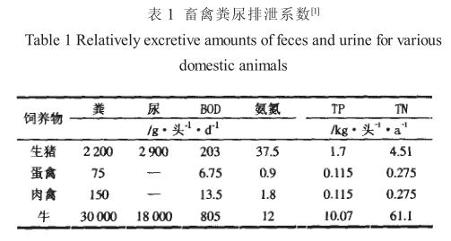 畜禽業(yè)是我國農業(yè)和農村經(jīng)濟的重要組成部分,畜禽養(yǎng)殖業(yè)大力發(fā)展所帶來的環(huán)境污染問題日益嚴重, 不僅影響經(jīng)濟發(fā)展, 而且還危及生態(tài)安全, 已成為人們普遍關注的社會問題。畜禽養(yǎng)殖場產(chǎn)生的糞便和污水造成地表水、地下水、土壤和環(huán)境空氣的嚴重污染, 直接影響了人們的身體健康和正常生產(chǎn)生活。畜禽養(yǎng)殖場未經(jīng)處理的污水中含有大量污染物質, 其污染負荷很高, 各類畜禽糞尿排泄系數(shù)見表 1 。這種高濃度有機廢水直接排入或隨雨水沖刷進入江河湖庫 , 大量消耗水體中的溶解氧 , 使水體變黑發(fā)臭。水中含有大量的 N 、P 等營養(yǎng)物是造成水體富營養(yǎng)化的重要原因之一, 排入魚塘及河流使對有機物污染敏感的水生生物逐漸死亡, 嚴重者導致魚塘及河流喪失使用功能。養(yǎng)殖污水長時間滲入地下, 使地下水中的硝態(tài)氮或亞硝態(tài)氮濃度增高, 地下水溶解氧含量減少, 有毒成分增多, 導致水質惡化, 甚至喪失其使用功能, 同時危及周邊生活用水水質。高濃度污水還可導致土壤孔隙堵塞, 造成土壤透氣、 透水性下降及板結、鹽化, 嚴重降低土壤質量, 甚至傷害農作物 , 造成減產(chǎn)和死亡。
