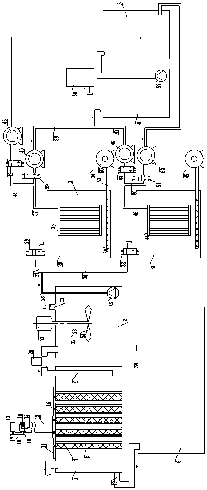 線反沖洗式養(yǎng)殖污水處理設(shè)備,包括過濾池、厭氧池、膜生物反應(yīng)池、消毒池、清水池和污泥池。過濾池中設(shè)有若干個格柵板,過濾池上設(shè)有用于提升格柵板的提升裝置,便于維護(hù)格柵