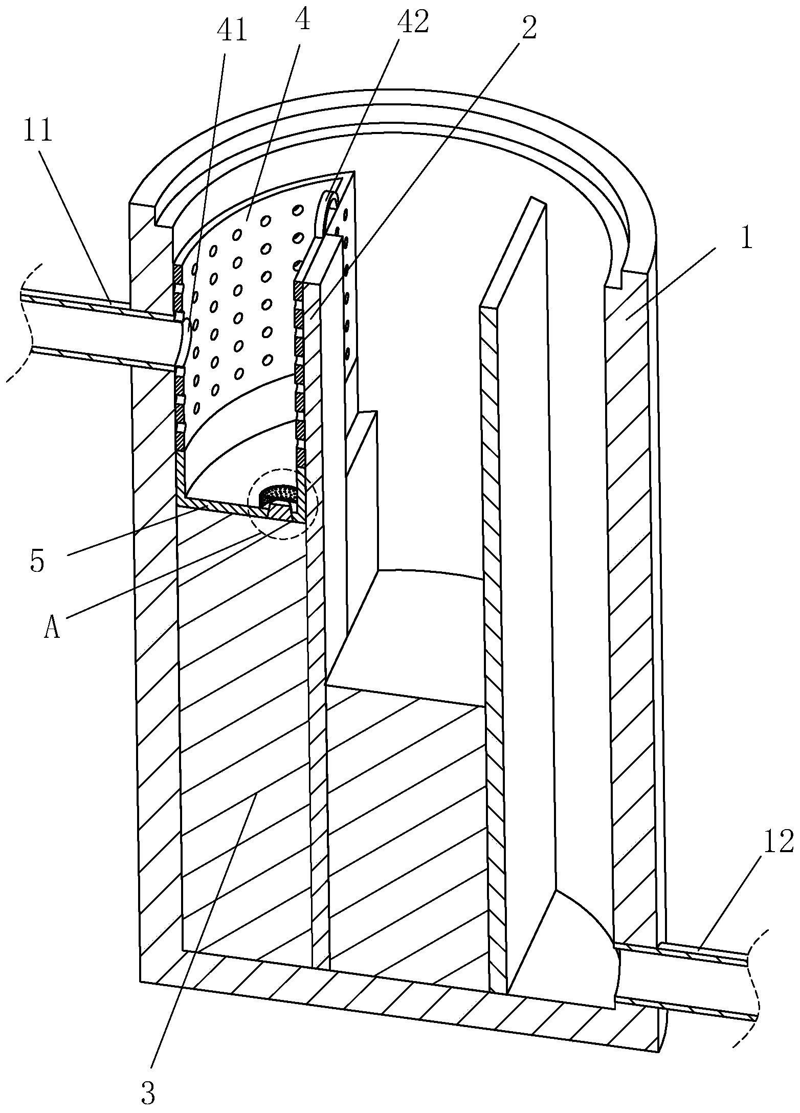 通過采用上述技術(shù)方案,水流從入口進入過濾網(wǎng)筒后,進入緩沖盒內(nèi),直到緩沖盒內(nèi)的水位到達緩沖盒的頂部后,水流從入口落到緩沖盒內(nèi)的存水中,緩沖盒內(nèi)的存水對水流起到緩沖作用,使水流的流速降低。