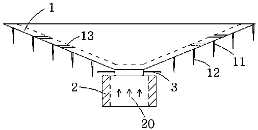 1.一種螺旋型污水處理旋混曝氣頭,包括倒錐形盤體(1),以及與該倒錐形盤體(1)的頂端相固定的底座(2);其特征在于:所述倒錐形盤體(1)的下表面制有從倒錐形盤體(1)的頂點出發(fā),向外旋轉(zhuǎn)輻射的螺旋導(dǎo)流壁(11),所述螺旋導(dǎo)流壁(11)上均布有向下延伸的鋸齒(12);所述底座(2)內(nèi)設(shè)有至下向上延伸的導(dǎo)氣管(20),從所述導(dǎo)氣管(20)送入的氣流向上沖擊到所述倒錐形盤體(1)的頂角,并在倒錐形盤體(1)的下表面順著所述螺旋導(dǎo)流壁(11)向外擴散。