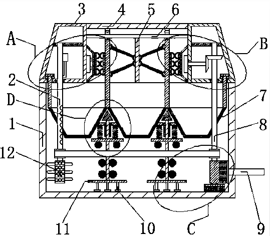優(yōu)選的,兩個(gè)相鄰的所述梯形篩網(wǎng)之間固定連接有直板,所述直板上開設(shè)有安裝槽,且安裝槽內(nèi)安裝有粗管,所述粗管內(nèi)套設(shè)有細(xì)桿,所述細(xì)桿的頂端穿過粗管,并延伸到直板的上方固定連接有三角形固定塊,所述細(xì)桿的底端穿過粗管固定連接有T形板,所述T形板的頂部和直板的底部靠近左右兩側(cè)處分別固定連接有壓縮彈簧。