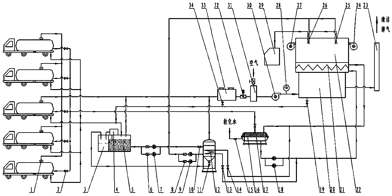 本發(fā)明涉及一種液體罐車蒸洗罐體廢水?廢氣聯(lián)合治理設(shè)備與工藝。其技術(shù)方案是:各零部件按功能構(gòu)成廢氣匯集部分、有機(jī)液體收集部分、廢水霧化噴燒部分、氧化熱量提取和利用部