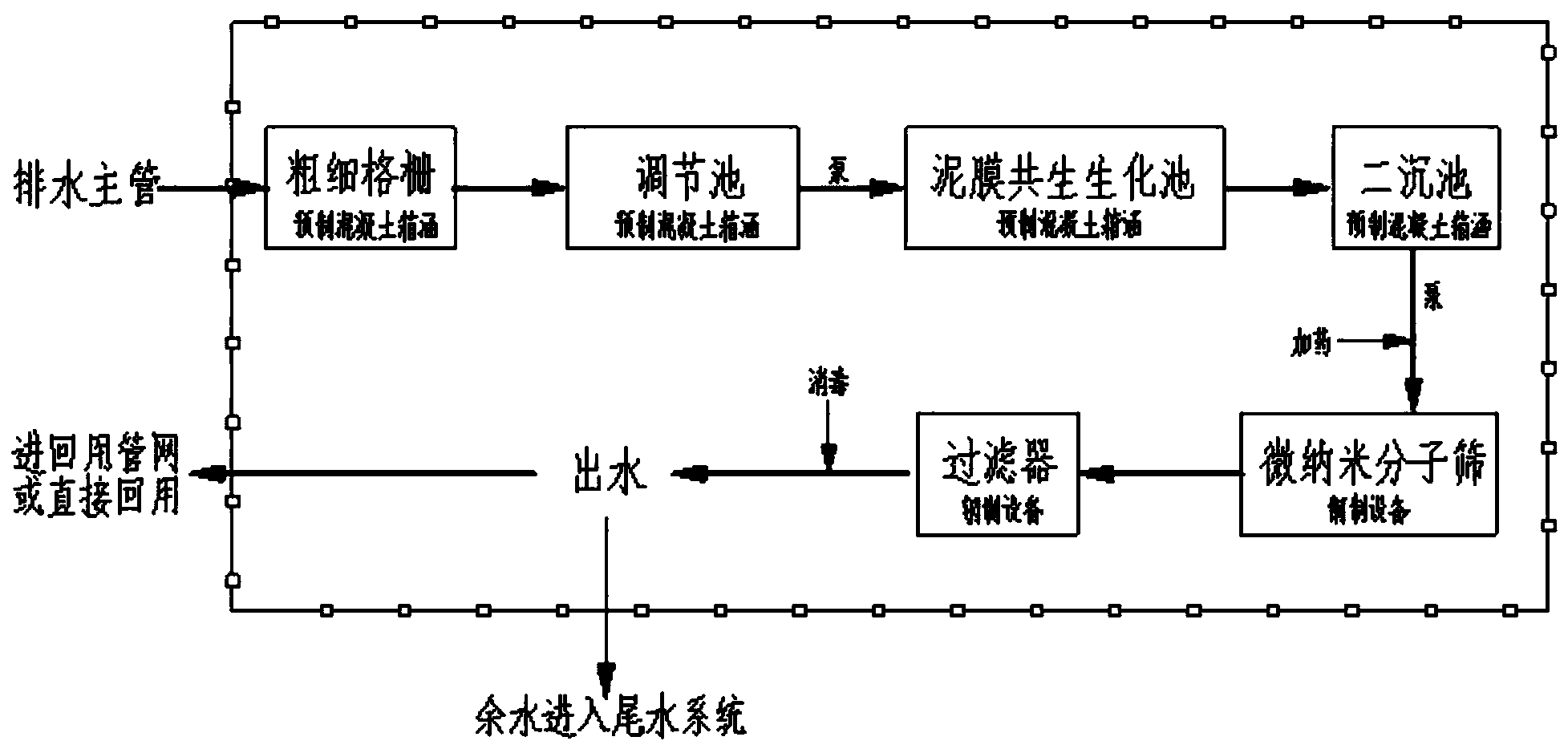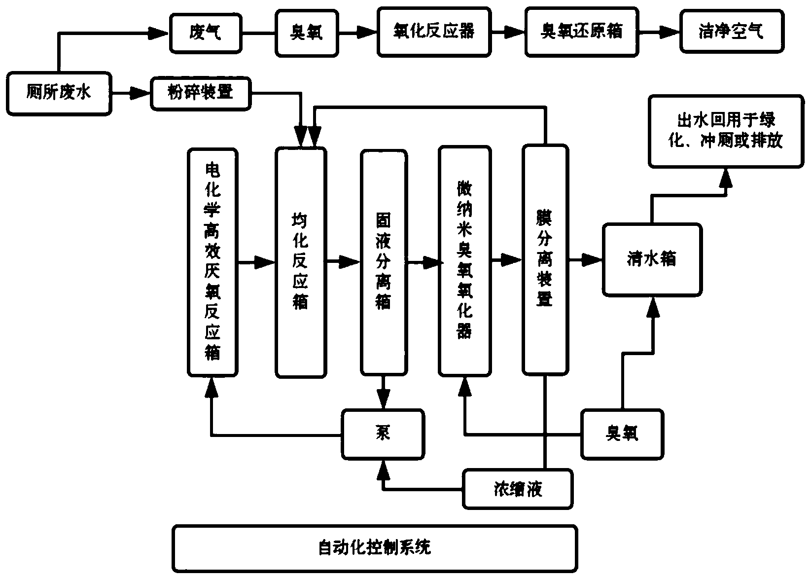 本發(fā)明屬于廁所廢水處理技術(shù)領(lǐng)域,尤其是一種廁所廢水循環(huán)使用處理裝置及其處理工藝,廁所產(chǎn)生的廢水首先進(jìn)入粉碎裝置,將顆粒較大的固體粉碎成便于處理的小顆粒,然后流入均
