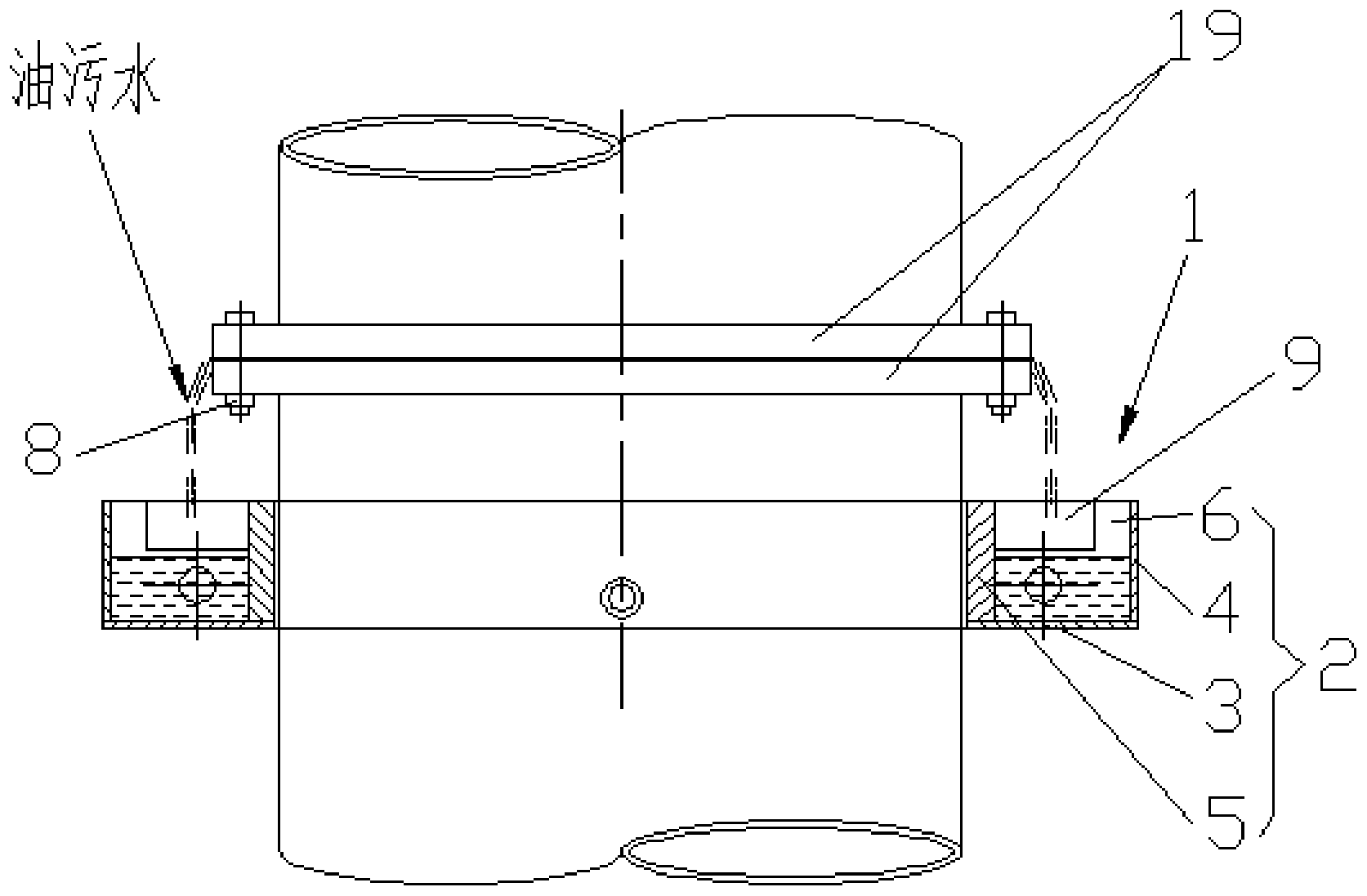 本發(fā)明涉及船舶管道維修工藝裝備技術(shù)領(lǐng)域,具體涉及一種管內(nèi)油污水收集裝置,包括一對采用哈夫?qū)咏Y(jié)構(gòu)的半環(huán)形污水收集槽,每一半環(huán)形污水收集槽包括作為槽底的半環(huán)形底板、