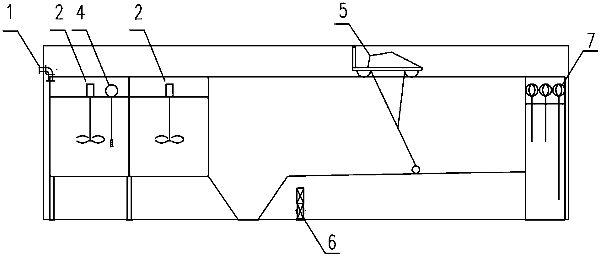 本發(fā)明提出了一種生活污水處理提標(biāo)工藝與裝置,屬于污水處理領(lǐng)域,主要解決現(xiàn)有污水處理工藝氨氮排放指標(biāo)過高、厭氧攪拌效率過低、MBR成本高的問題。它采用柔性管擺噴流體攪拌