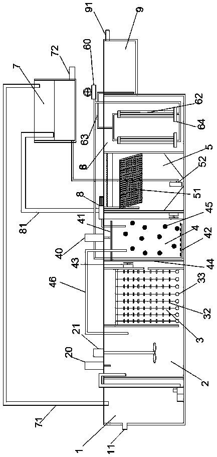 8.根據(jù)權(quán)利要求1所述一體化MBR膜污水處理設(shè)備,其特征在于,所述好氧池底部設(shè)置有若干個左右交錯設(shè)置的曝氣盤,位于同一列的曝氣盤等距分布。