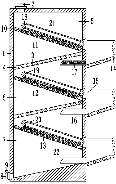 本發(fā)明的目的在于克服現(xiàn)有技術(shù)中存在的上述問題,提供一種工業(yè)污水治理用污水處理裝置,便于在同一箱體中對污水進(jìn)行逐級過濾處理,減少使用的設(shè)備,降低生產(chǎn)成本。