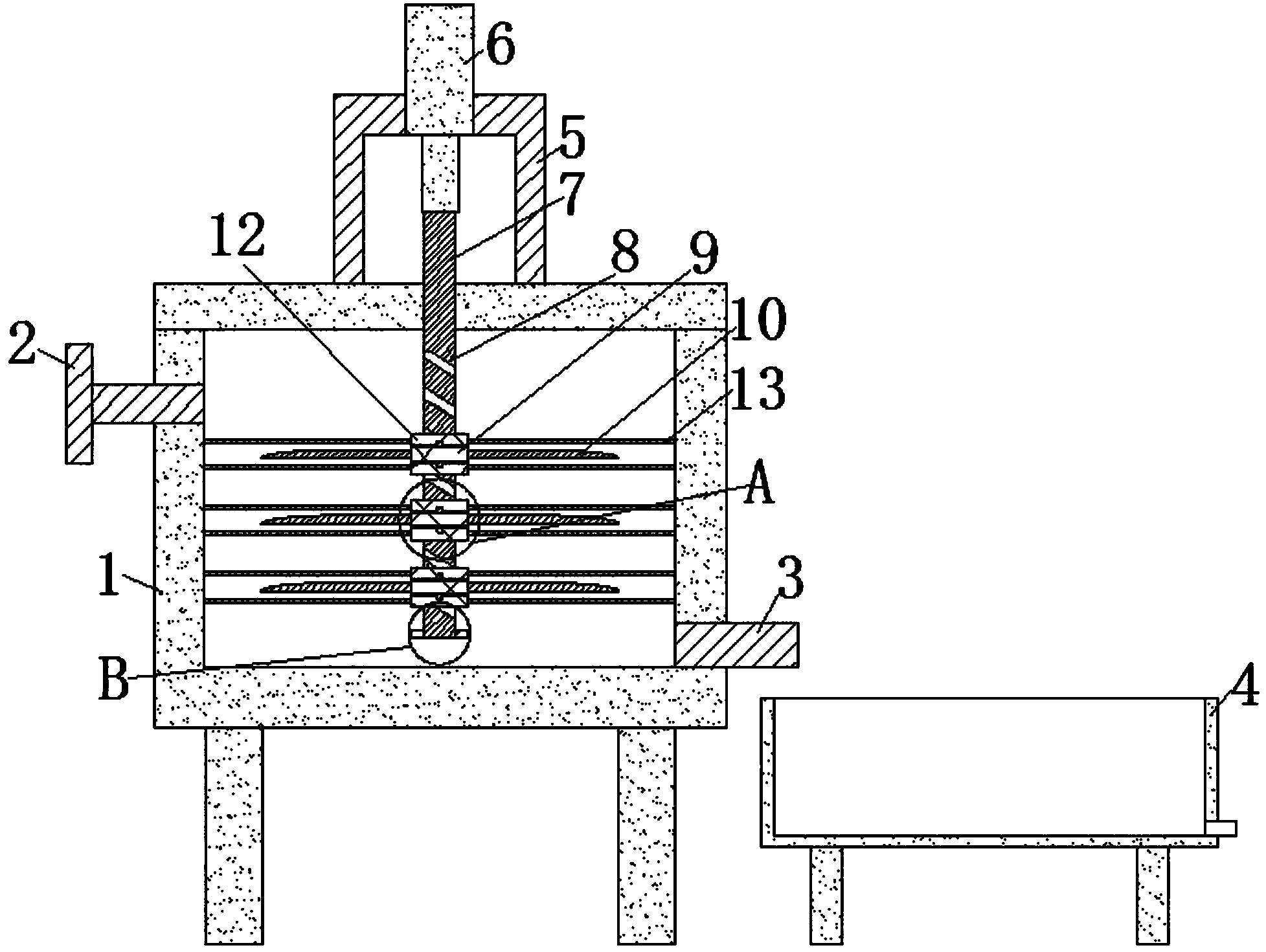 本實用新型公開了一種污水處理裝置的攪拌機(jī)構(gòu),包括攪拌室、注入口、輸出口和收集框,所述注入口固定連接在攪拌室的一側(cè),所述輸出口固定連接在攪拌室的另一側(cè),所述收集框放