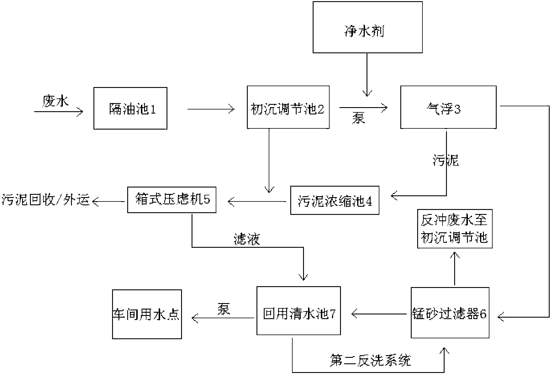 本實(shí)用新型公開一種水晶加工污水回用系統(tǒng),包括:隔油池,其具有隔油池進(jìn)水口;初沉調(diào)節(jié)池,其進(jìn)水口與隔油池出水口通過接管相連;氣浮,其進(jìn)水口與初沉調(diào)節(jié)池出水口通過泵及接