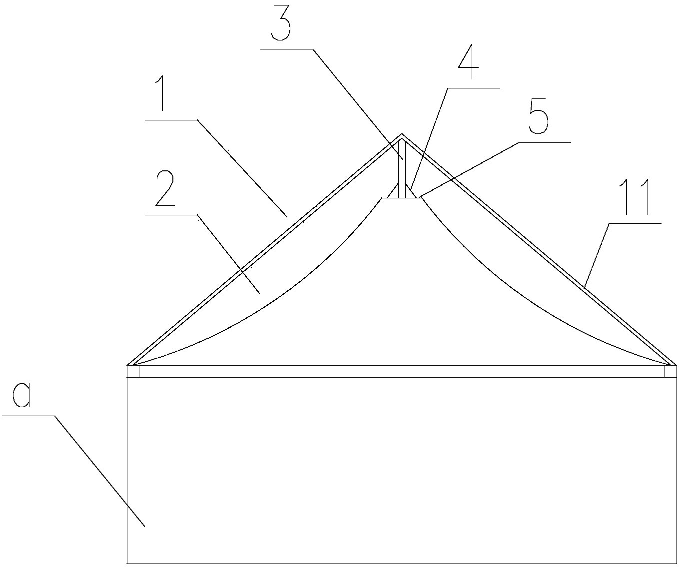 本實(shí)用新型公開了一種污水廠反吊膜密封收集裝置,包括鋼架密封蓋和吊膜,鋼架密封蓋包括至少兩個(gè)支撐臂,相鄰支撐臂的頂部連接并形成夾角,支撐臂上設(shè)有安裝桿,安裝桿的一端