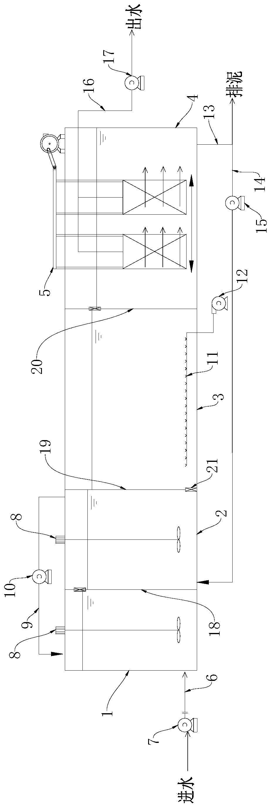 本發(fā)明屬于污水處理設(shè)備技術(shù)領(lǐng)域,具體是一體化MBR膜污水處理設(shè)備,包括箱體,箱體內(nèi)設(shè)有依次連通的調(diào)節(jié)池、缺氧池、好氧池、膜反應(yīng)池、沉淀池、消毒池,膜反應(yīng)池內(nèi)設(shè)置MBR膜,